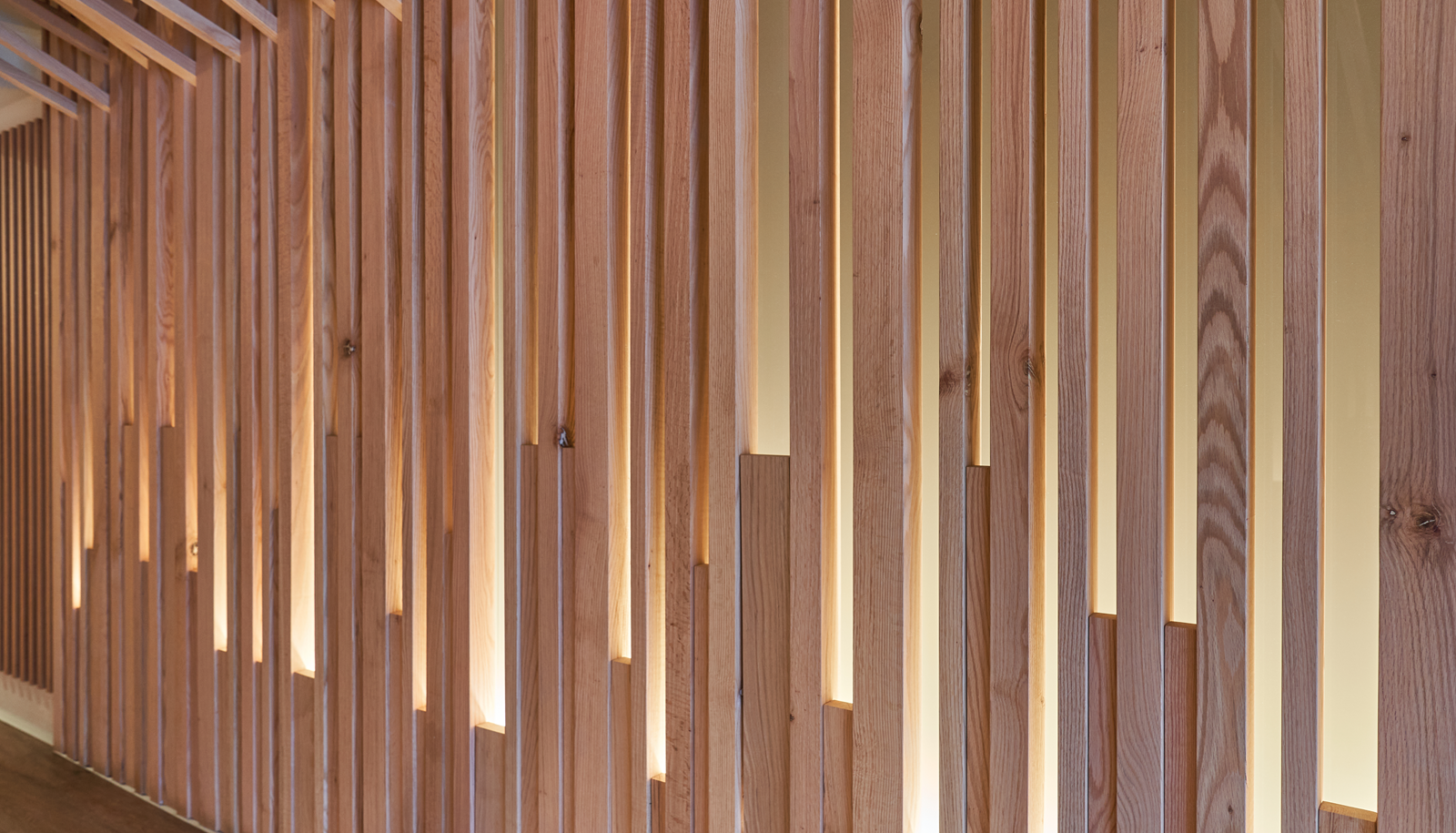 - Revestimientos de pared y techos en madera: aportan calidez y mejoran la acústica.